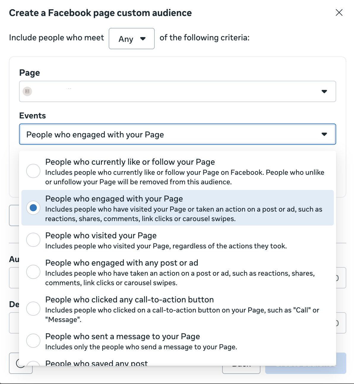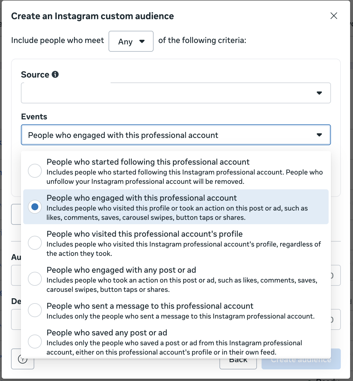 На етапі створення аудиторії можна обрати різні типи взаємодій: