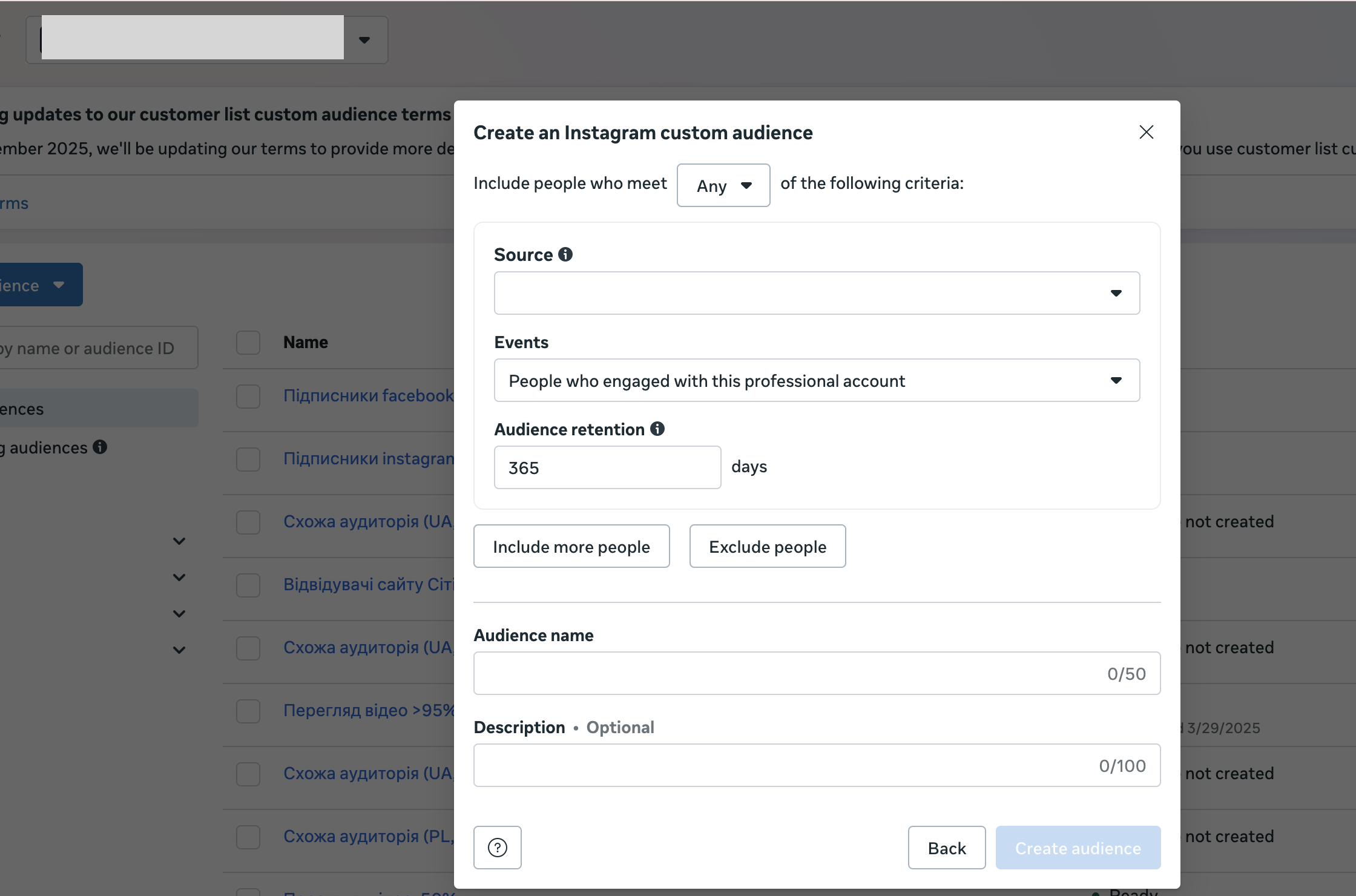 Порада: створюйте кілька сегментів — “Engaged audience – last 30 days”, “Engaged audience – last 180 days”, “Engaged audience – last 365 days”, щоб підвищити ефективність ремаркетингу.