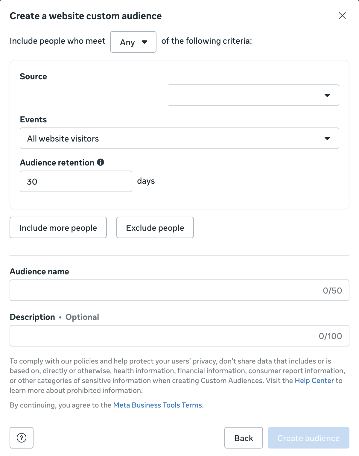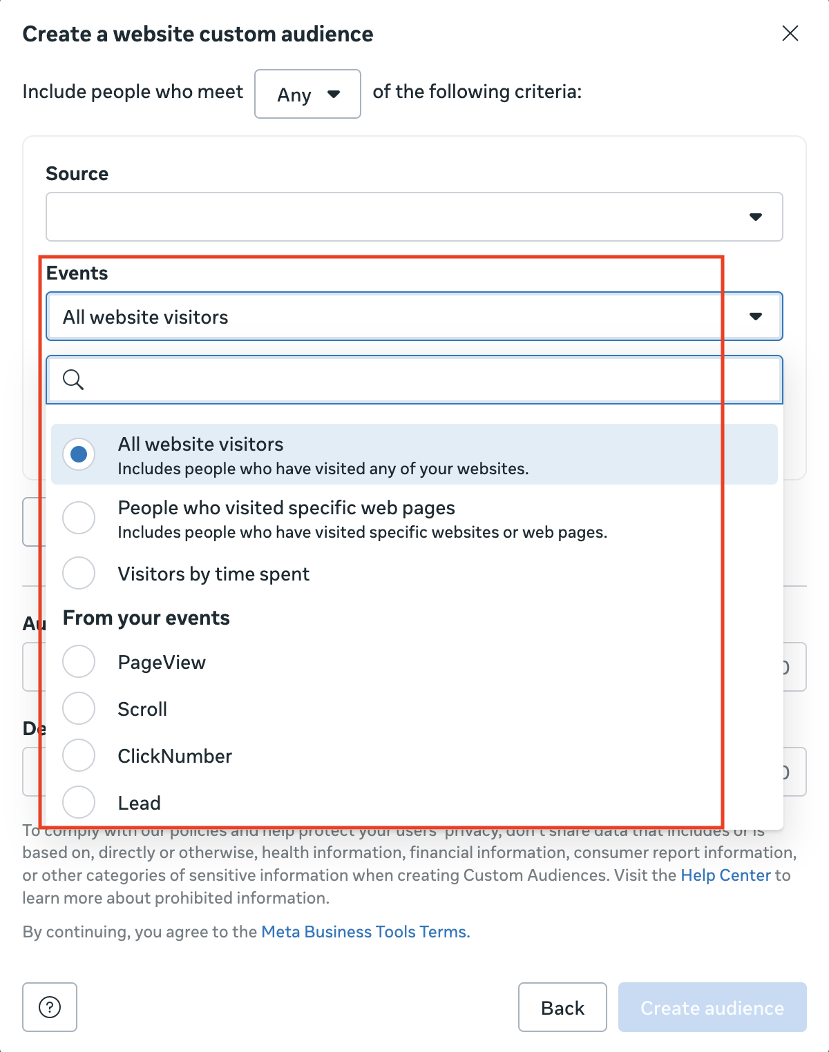 Щоб створити аудиторії на основі дій користувачів на сайті, необхідно мати встановлений Meta Pixel на сайті. Після його інтеграції ви отримуєте можливість збирати користувачів у сегменти залежно від їхніх дій на сайті.