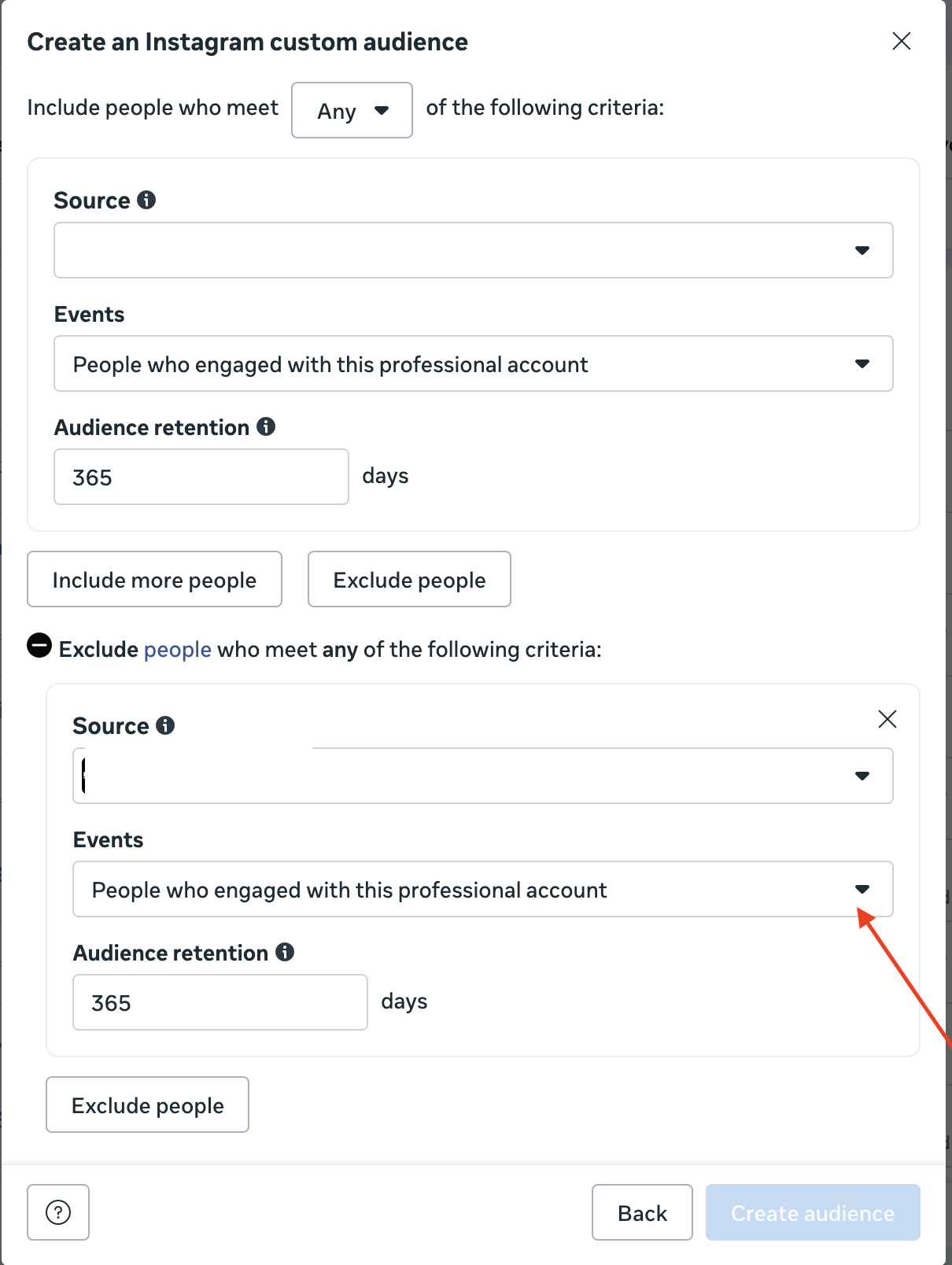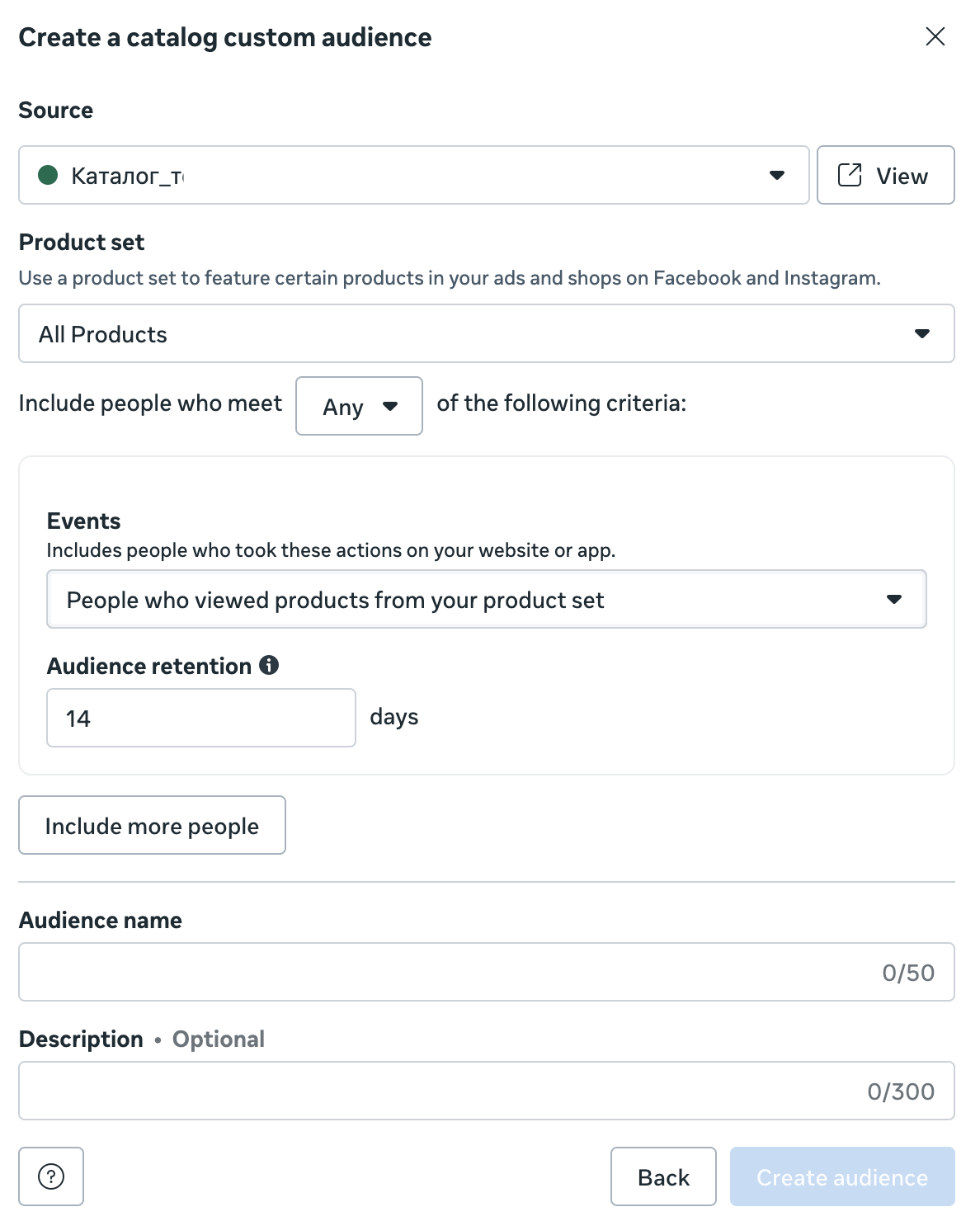 Також перевірте період збирання аудиторії (наприклад, 7, 14 або 30 днів). Коротший період дає гарячіших користувачів, але меншу вибірку, тоді як довший — більше охоплення, але нижчу конверсію.
