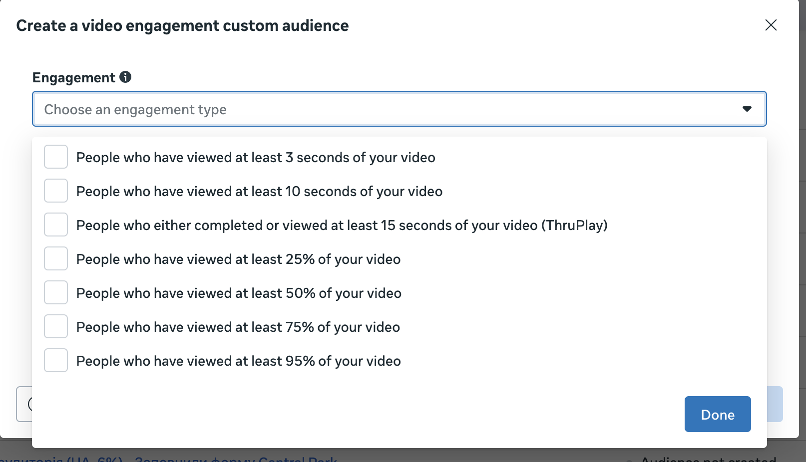 Це аудиторії, сформовані з користувачів, які переглядали ваші відео в профілі або рекламних оголошеннях. Ви можете обрати конкретне відео та налаштувати глибину перегляду — наприклад, 25%, 50%, 75% чи 95%.
