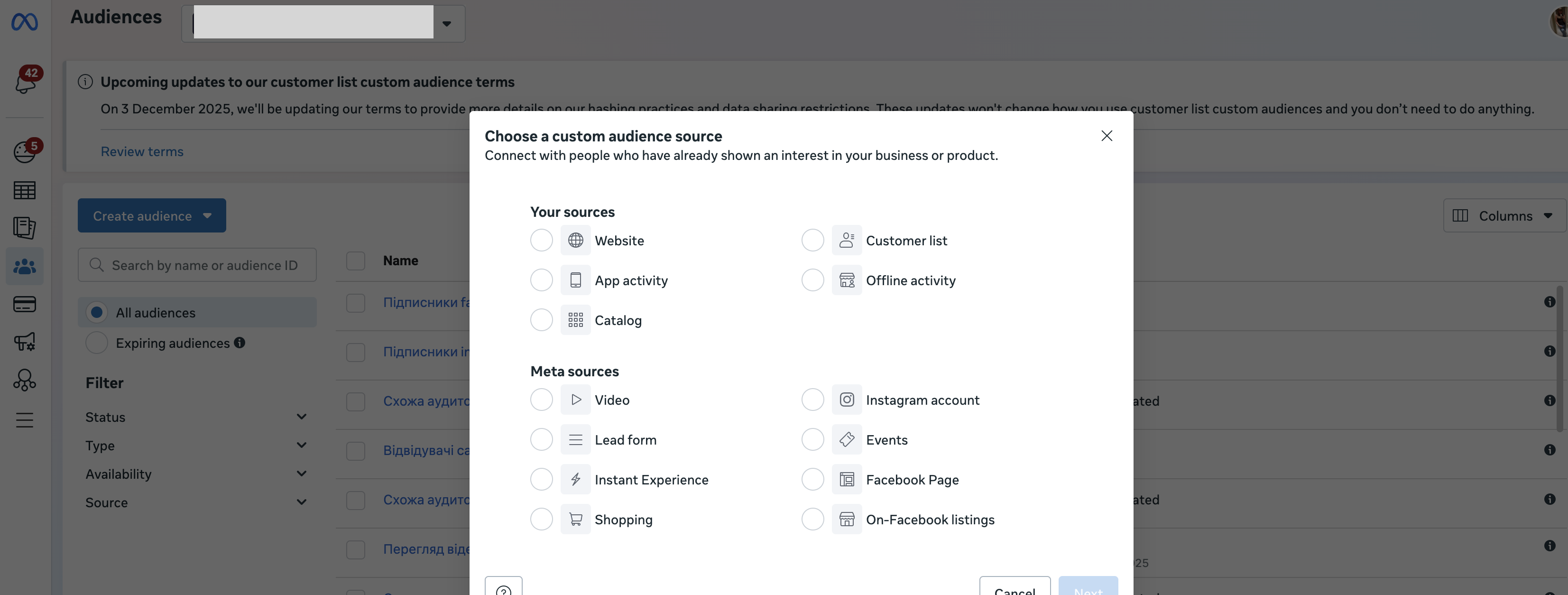 Meta пропонує різні типи аудиторій для ремаркетингу — залежно від того, з чим взаємодіяв користувач: сайт, додаток, Instagram, Facebook, відео чи каталог товарів.